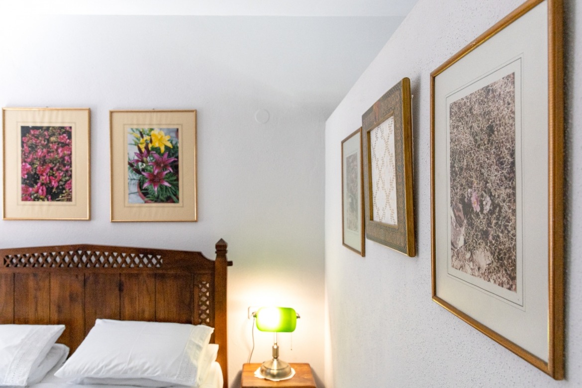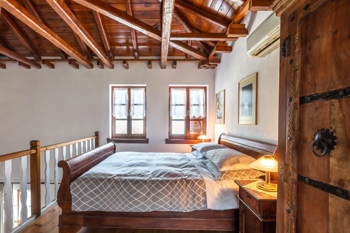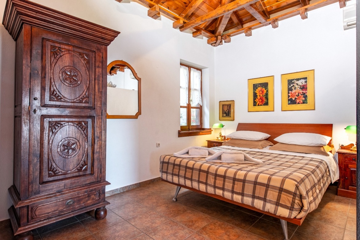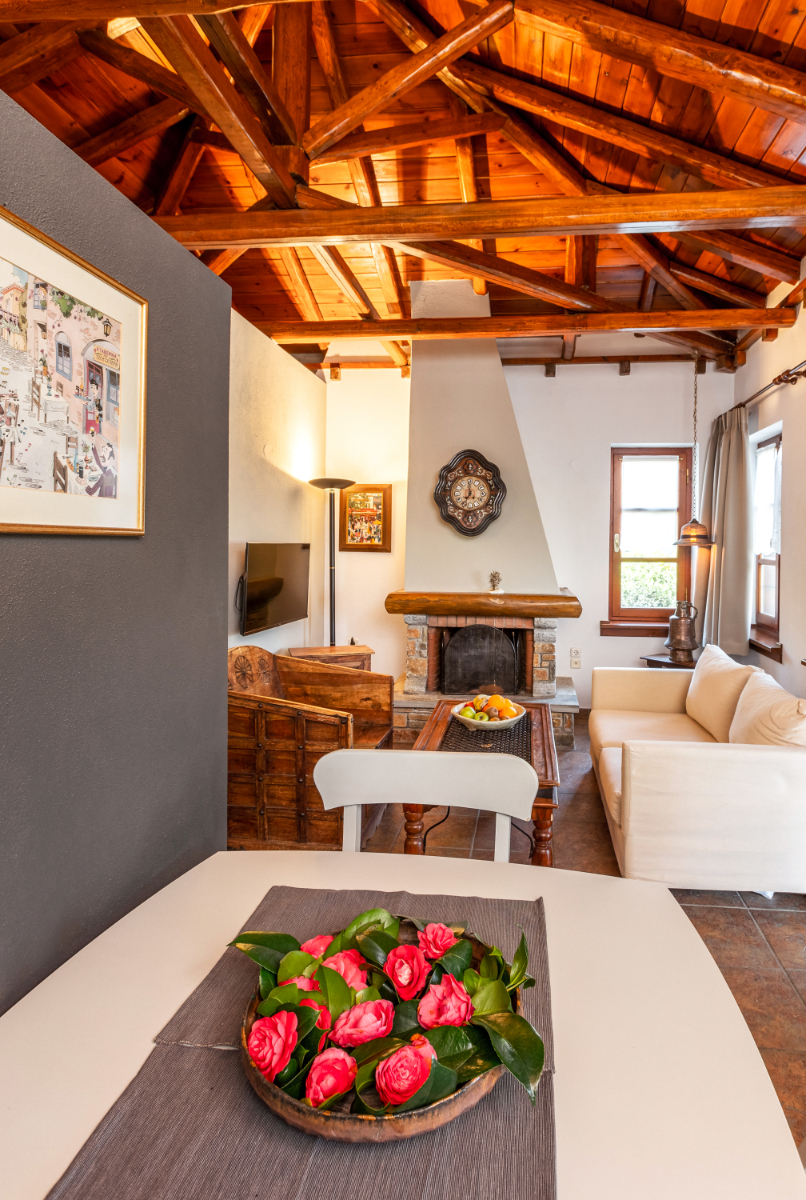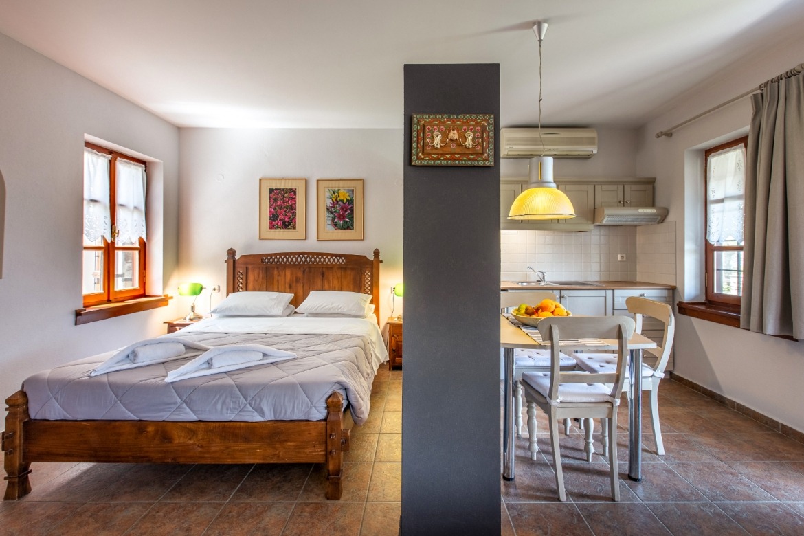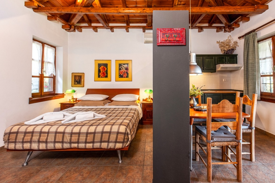 with its beautiful fireplace covered with Pelion slates, its wooden ceiling and wood-carved works of art (by the artist Chronis) will make you feel at home, like you are living in a traditional Pelion house, with the hospitable people of Gardenia around you. Studio:6 offers many facilities such as a bathroom, a hairdryer, an air-conditioning system, a TV, a Wi-Fi and a fully-equipped kitchen. The wooden bed matches nicely with the wood-carved paintings, bringing a feeling of warmth and hospitality to the room.